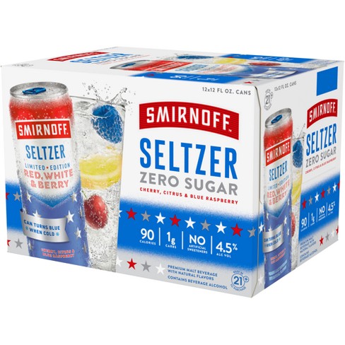 Smirnoff Red, White & Berry Seltzer 12 oz Cans - Shop Beer & Wine at H-E-B Smirnoff Red, White & Berry Seltzer 12 oz Cans 12 pk $14.70 ($0.11/fl oz) Product description Light, crisp and bubbly, Smirnoff Seltzer Red, White & Berry is Americau001as Seltzer! Enjoy the blend of tart cherry, citrus overtones and blue raspberry flavors with ZERO SUGAR, natural flavors, only 90 calories, and just 1g of carbs.