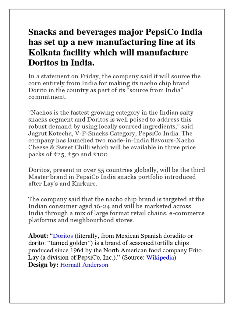 Doritos | Culture Wikia | Fandom Template:Lead too short Doritos (English pronunciation: Expression error: Unrecognized punctuation character "[".) is a brand of flavored tortilla chips produced since 1964 by American food company Frito-Lay (a wholly owned subsidiary of PepsiCo). In the United States, Frito-Lay eliminated trans fat from all Doritos varieties in 2002. The same year, the Doritos brand ase sales in 2006, the ...