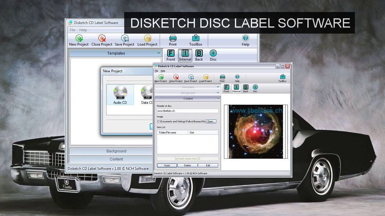 Disketch Disc Label Software Use Disketch Label Maker to create CD and DVD labels as well as cover images for jewel cases. You can import your own artwork, or set a simple background color and organize artist information along with track lists. Get it Free. Disketch free disk labeling software is available for non-commercial use only. You can download the free version here.