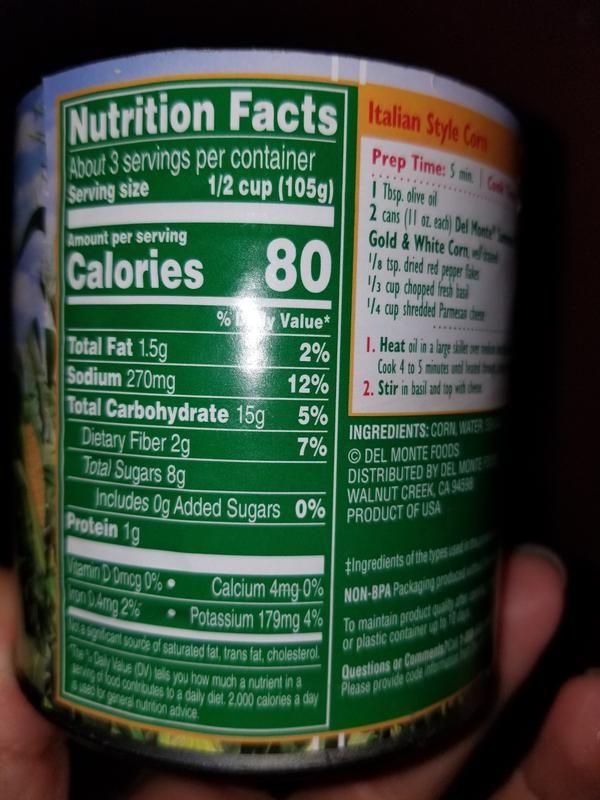 Canned & Jarred Corn - Amazon.com Del Monte Fresh Cut Sweet White Whole Kernel Corn, Canned Vegetables, 15.25 Oz, Pack of 12. 4.7 out of 5 stars 554. ... Calories Per Serving. 0 Calories; Up to 40 Calories; 40 to 100 Calories; 100 to 200 Calories; 200 to 300 Calories; Fat Calories Per Serving. 0 Calories <40 Calories; Nutrition Facts.