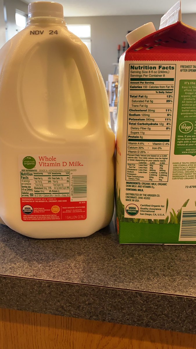 Nutrition Facts for Kroger Whole Milk (Lactose Free) Kroger Whole Milk (Lactose Free) Nutrition Facts. Serving Size. cup. Amount Per Serving. 150. Calories % Daily Value* 12%. Total Fat 8g. 25% Saturated Fat 5g Trans Fat 0g. 10%. Cholesterol 30mg. 4%. Sodium 100mg. 4%. Total Carbohydrate 12g. 0%. Dietary Fiber 0g