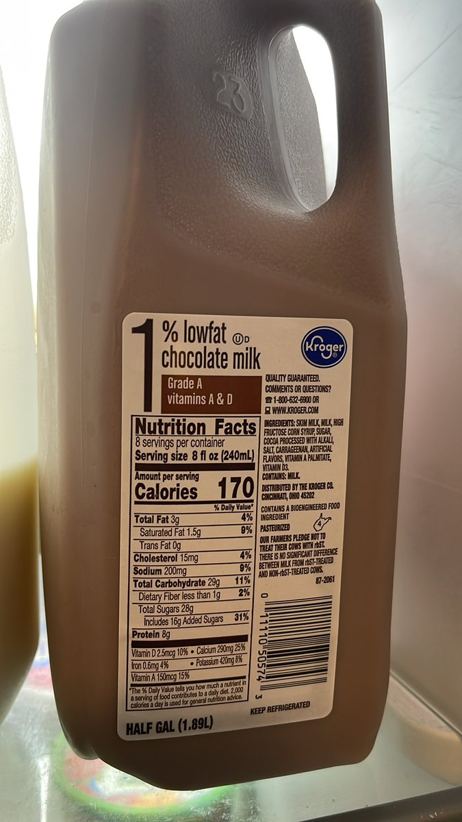 Kroger® 1% Lowfat Chocolate Milk, 1/2 gal - Kroger Nutrition Facts 8.0 Exact servings per container Serving size 8 fl oz (240 mL) Amount per serving Calories 170 % Daily value* Total Fat 3g 4% Saturated Fat 1.5g 9% Trans Fat 0g Cholesterol 15mg 4% Sodium 200mg 9% Total Carbohydrate 29g 11% Dietary Fiber 1g 2% Sugar 28g Protein 8g 17% Calcium 290mg 25% Iron 0.6mg 4% Potassium 420mg 8%