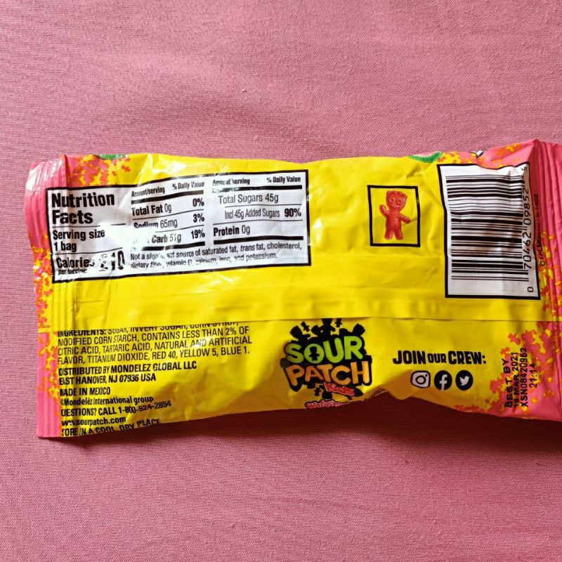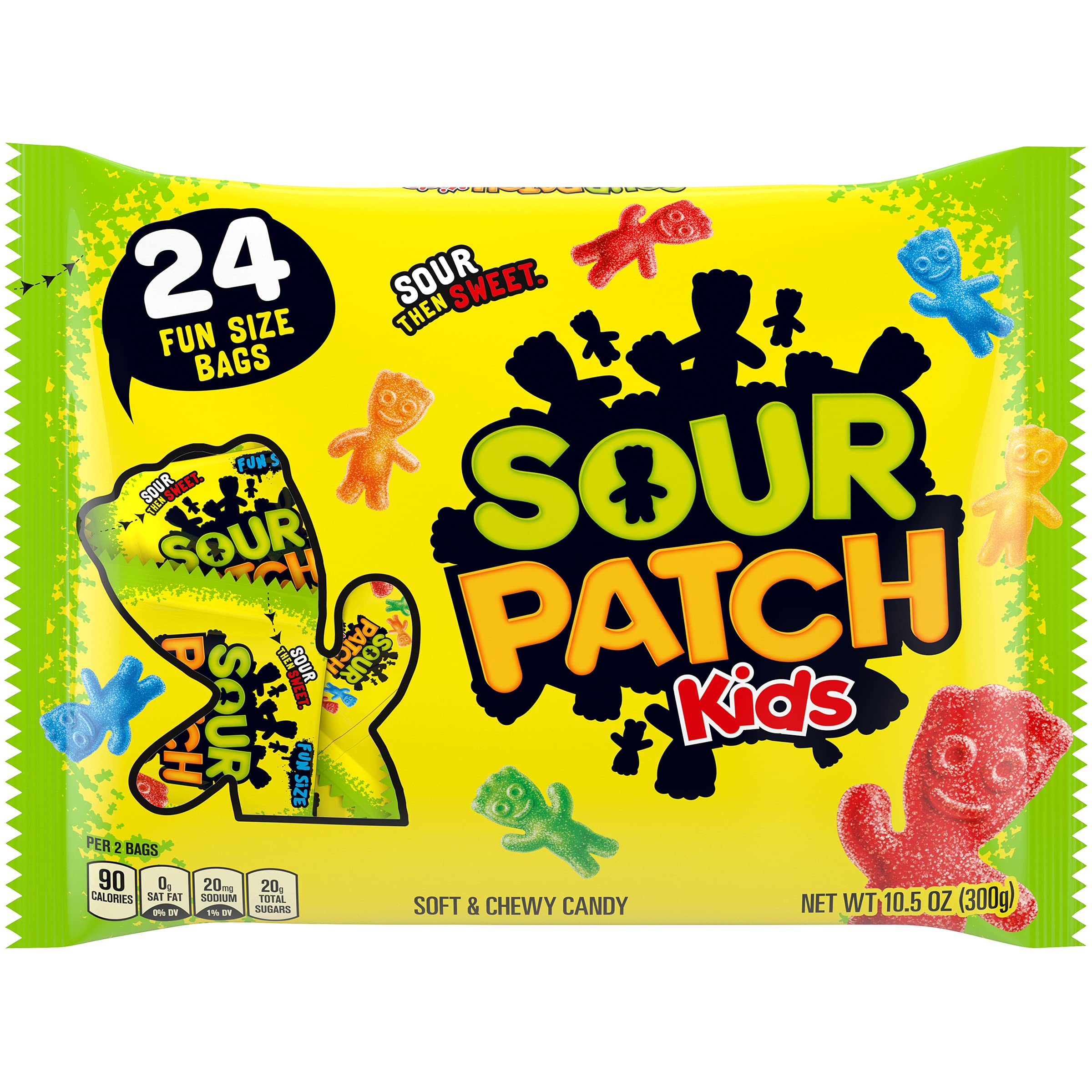 Sour Patch Kids Chewy Candy - Fun Size Nutrition Facts: This pouch size is 30 grams and serving size is 2 pouches. 110 calories per serving size. 0 grams of fat, 0 grams of trans fat and saturated ...