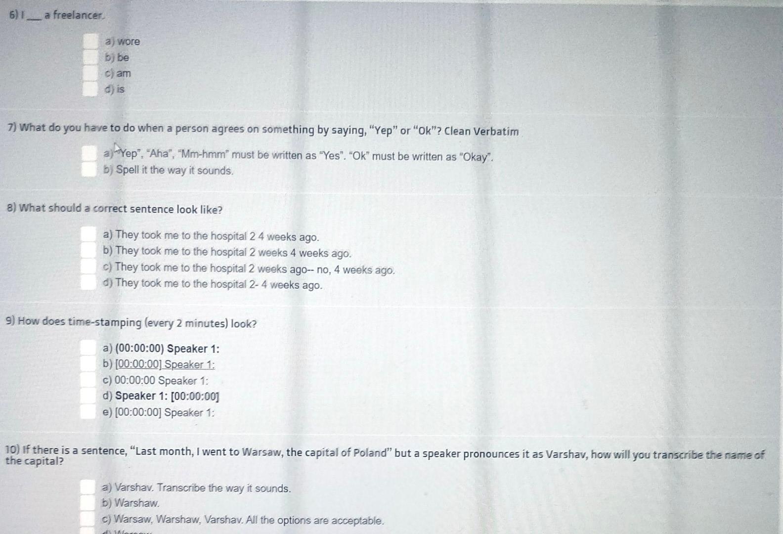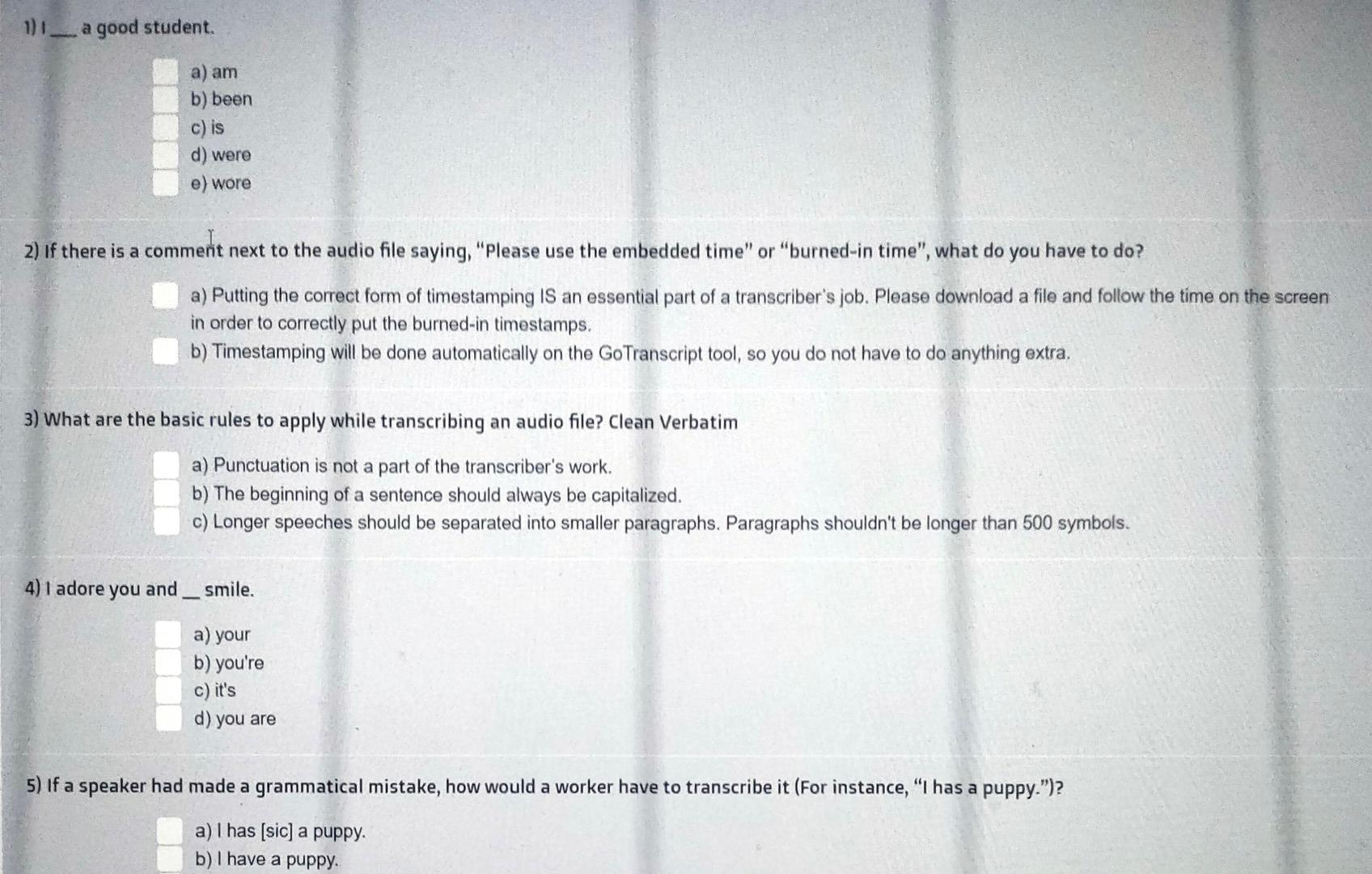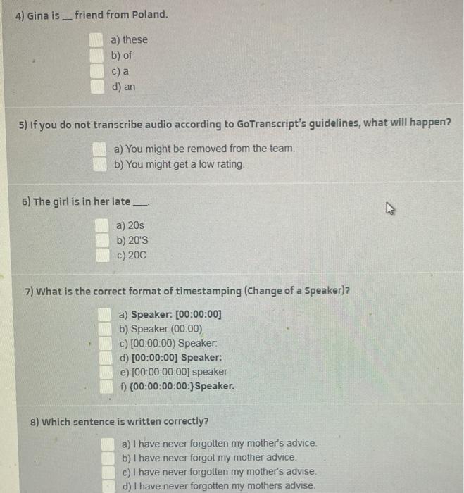 How to Format a Transcript: Everything There is to Know About ... Add a title and subheadings to your transcript. If a speech is long, break it into paragraphs of 400 to 500 characters each. Don't indent the paragraphs. Speaker Labels Speaker labels are the terms you use to identity speakers in the video or audio file. When labeling a speaker, use their name, role, or a generic label such as "S1" or "Speaker 1". GoTranscript Audio Test 2022—Answered! - Varsity Scope 13. Speaker labels. When given the audio, you have to create or find the speaker labels. They help a reader to keep up with the conversation. In case the name of the speaker is mentioned, you should indicate the speaker label. This remains intact even when there is only one speaker. GoTranscript Audio Test Answer 29 August 2020 a) Use speaker labels but with a question mark before. For example, ?Speaker 1, ?Speaker 2, et cetera. b) Use any speaker labels. An editor will correct it. 3) The correct form of timestamping is: a) [00:00:00:00] b) [00:00:00] c) {00:00:00:00:} d) (00:00:00) 4) When should timestamping (Every 2 minutes) start in the audio segment of 15-20 minutes? What is the proper format of a speaker label (Speaker)? | Correct ... My Website link: is the proper format of a speaker label (Speaker)?a. Speaker-b. Speaker :c. Speaker:d. S...