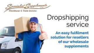 Supplement dropshippers | Specialist Supplements Ltd Supplement dropshippers UK. Suppliers of wholesale vitamins and supplements to trade. Own label products and dropshipping available. Fast, reliable service. No contracts; no monthly fees.