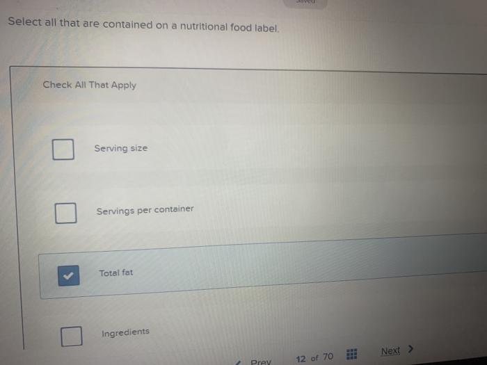Food Label Flashcards | Quizlet An area of the food label called the ____________ provides a nutritional snapshot, including Daily Values, of the food inside a package. Ingredients A section of the label must include a list of __________________, or the individual components of the product, listed in descending order by weight. Net Weight How are ingredients listed on food label quizlet? On a food label, what is listed in descending order by weight? All ingredients, including added water, must be listed in descending order by weight. The first ingredient is present in the most amount. Last but not least, the ingredient listed above is present in the least amount possible. Which foods are exempt from the federal food labeling law? Nutrition ch9 quiz Flashcards | Quizlet A On a food label, food ingredients are listed in order by Select one: a. name, in alphabetical order b. volume, from least to greatest c. weight, from most to least d. calorie content, from most to least C The food label on a package of crackers indicates a percent Daily Value for iron of 15%. This means that Select one: How must ingredients be listed on a feed label for animals? How must ingredients be listed on a feed label quizlet? All ingredients, including food additives should be listed in descending order by the amount of weight they are in the product. What are the 5 food label requirements? 5 Basic Elements that MUST be on Your Food Label. Ingredients. Sugar, fat, and sodium content. Calorie counts and serving ...
